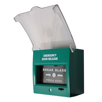 - ULTRA ACCESS, Break glass unit, GREEN, Unit reads "Emergency Door Release", Glass reads "Emergency Break Glass Press Here", 2 pole, Double change over contact,