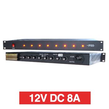 - PSS, Power supply, 12V DC 8A, 1RU 19" rack mount, Overload/Over Voltage/Input fuse protection, 8 x 1A fused outputs, Circuit status LEDs, Suits CCTV apps,