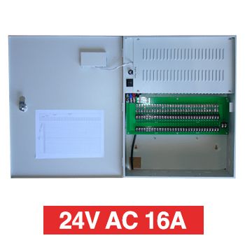 - PSS, Power supply, 24V AC 16A, Wall mount, Short circuit protection, 32 x 1A fused outputs, Circuit status LEDs, Voltage display, Suits CCTV apps,