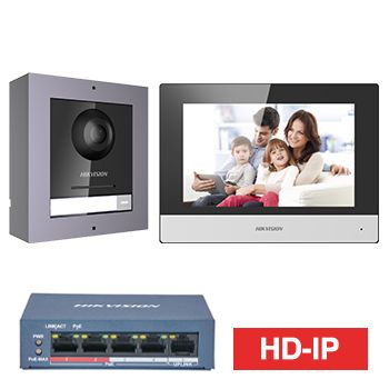 - HIKVISION, Intercom, Gen 2, HD-IP intercom kit, includes 1 x DS-KD8003-IME1/Surface door station, 1 x DS-KH6320-WTE1 7" room station, 1 x 4 Port POE switch, Surface door stn, WiFi, Black, AU adapter
