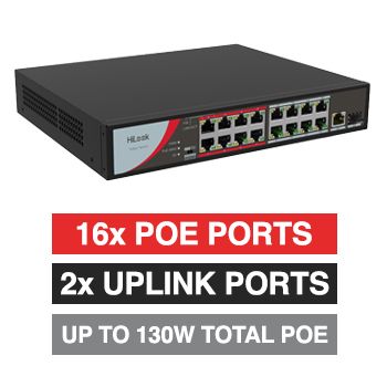- HILOOK, 18 Port Ethernet POE network switch, Unmanaged, 16x 10/100Mbps PoE ports, 1x 10/100/1000Mbps Uplink port, 1x 1000Mbps SFP, Max port output 8.1W power, Total POE power up to 130W, IEEE802.3af,