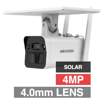 - HIKVISION, 4MP Solar-powered HD-IP Outdoor Bullet camera, White, 4G-LTE, Smart Events, 4.0mm fixed lens, 4MP 1/3" CMOS, 0.01 Lux, 30m IR Max, H.265 & H.265+, Audio, IP67, Lithium battery, Solar panel,